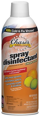 Chase’s Home Value™ Disinfectant Spray kills Rhinovirus Type 39 (the leading cause of the common cold) Pandemic 2009 (H1N1) Influenza A Virus, Staphylococcus aureus, Salmonella enterica, Pseudomonas aeruginosa, Streptococcus pyogenes, Vancomycin-resistant Enterococcus faecalis (VRE), Methicillin-resistant Staphylococcus aureus (MRSA) and Trichophyton mentagrophytes (athlete's foot fungus).