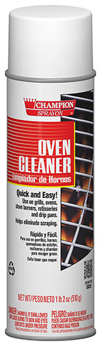 Champion Sprayon® Oven Cleaner rapidly softens hard, black, baked-on grease and built-up food deposits in institutional ovens. The most hard-baked food deposits are easily removed without scraping. Effective daytime or nighttime cleaner.